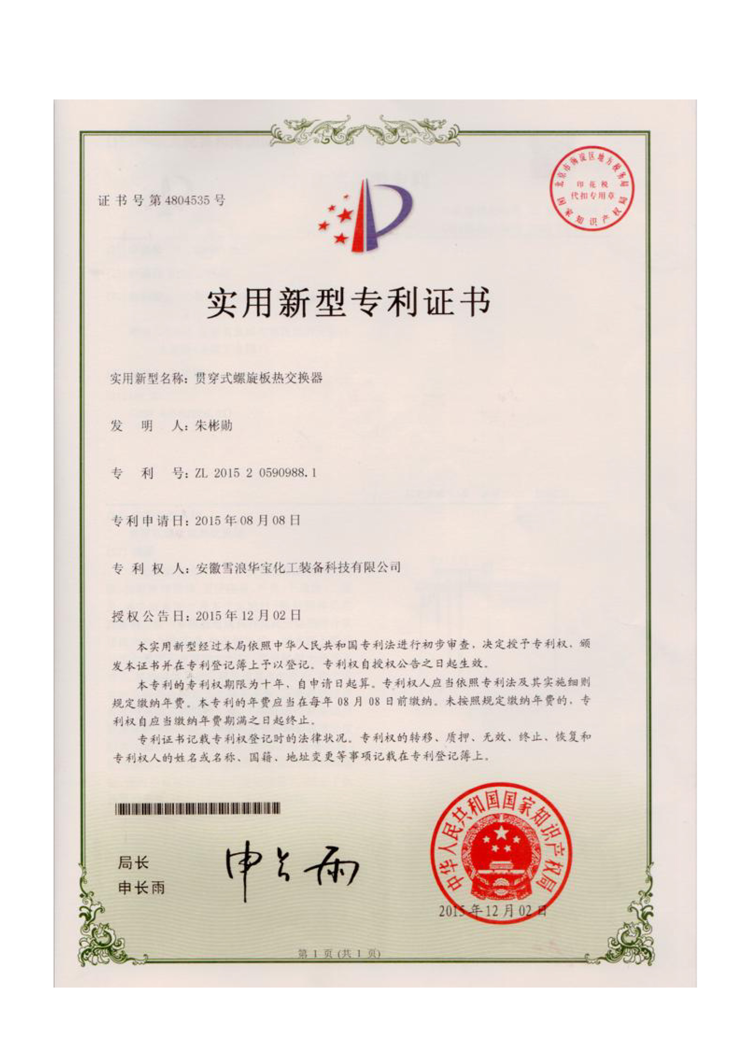 實(shí)用新型專利證書